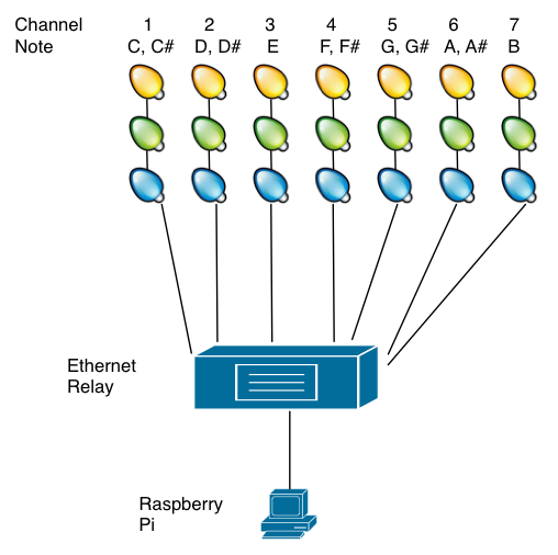 My basic idea was: Let start with something simple but expecting a great result. So I got and connected an ethernet-based relay (Did not have such a long USB cable) to a bunch of christmas lights and my Raspberry Pi. In the next step I created a controller programm and some midi files for having content. This together enabled me to control christmas lights synced to some christmas music. The control program maps the note on/off events to relay on/off events using the relay’s output channels. Below you can see how it’s connected.